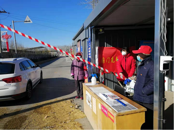 佟辛庄村,志愿者正在操作进出两口横杆