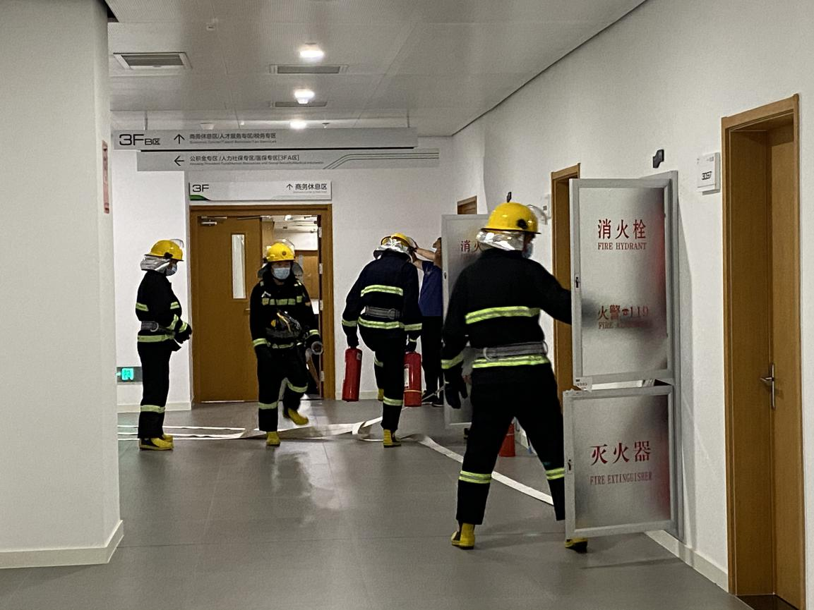 此次演练设置场景为政务中心6号电梯厅三层北侧办公室突发火情,由此展开消防应急疏散和紧急处置。演练过程中,各演练小组按《政务中心办公大楼火灾事故应急预案》职责分工迅速到位,全员进入消防应急状态,有序快速从消防通道撤离到紧急避难场所,6分钟内,完成灭火及全体人员疏散集。